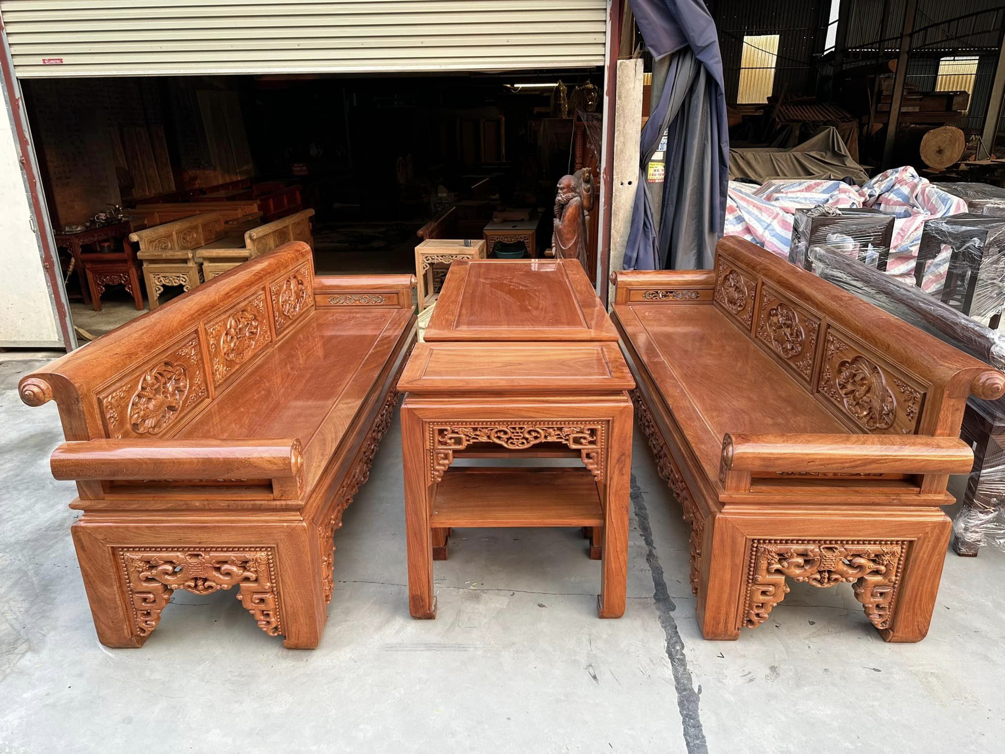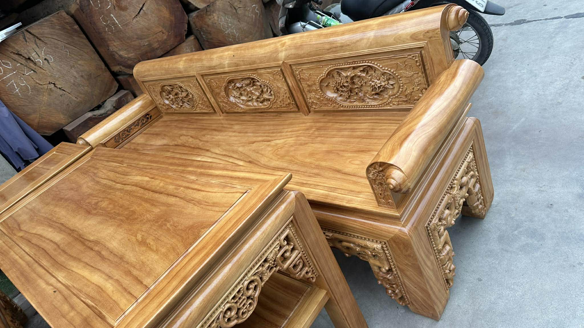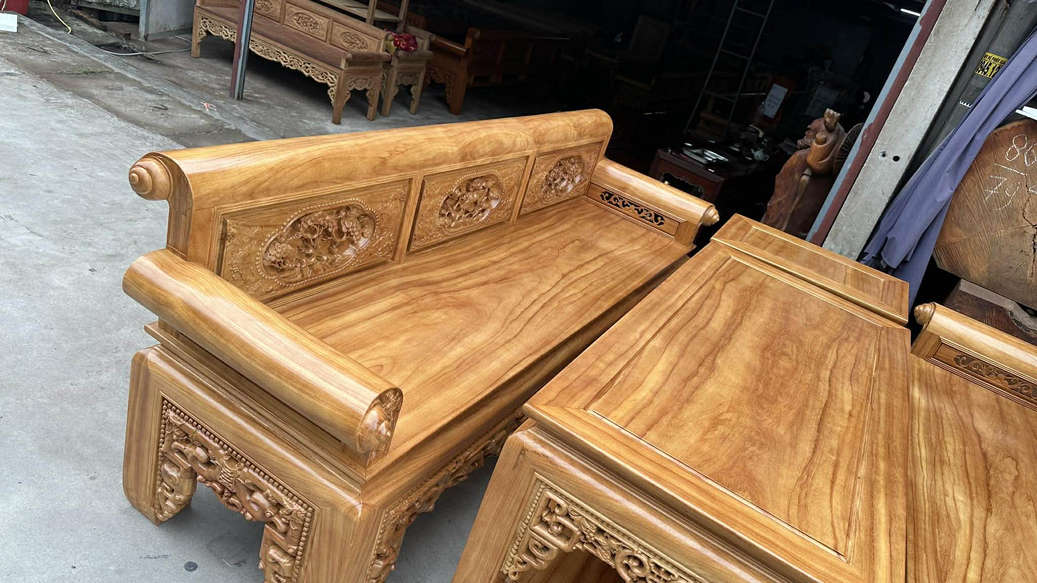 Kích thước dài 2m37 rộng 69 cao 85, chân vuông 10Cm, tay quốn dầy 10cm, rộng 16cm, mặt dầy 1.8cm ván yếm dầy 4cm, bàn 67/147 đôn 67/42.